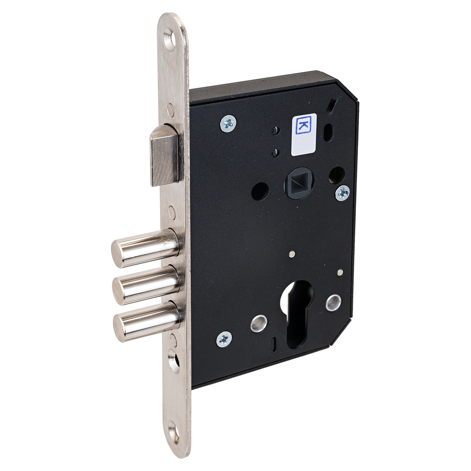 Три цилиндрических ригеля, диаметром 11,5мм, вылет 24мм. Межосевое расстояние 55мм. Удаление ключевого отверстия 55мм. Стальная торцевая планка, покрытие - никель, ширина планки 22мм.