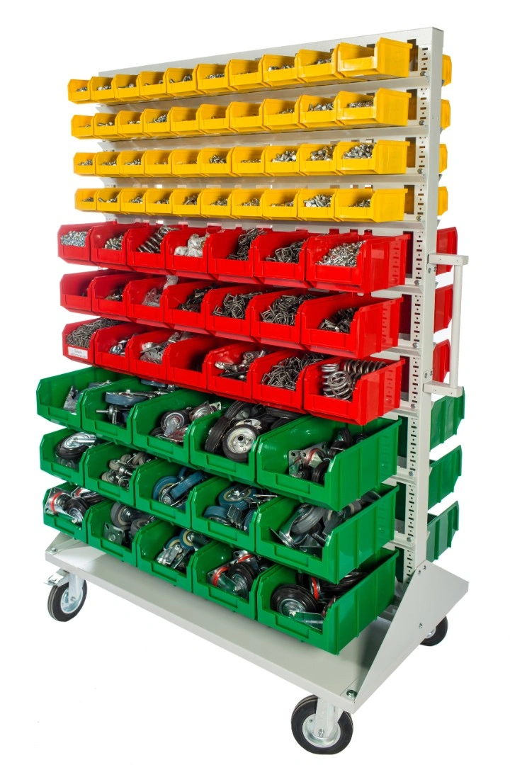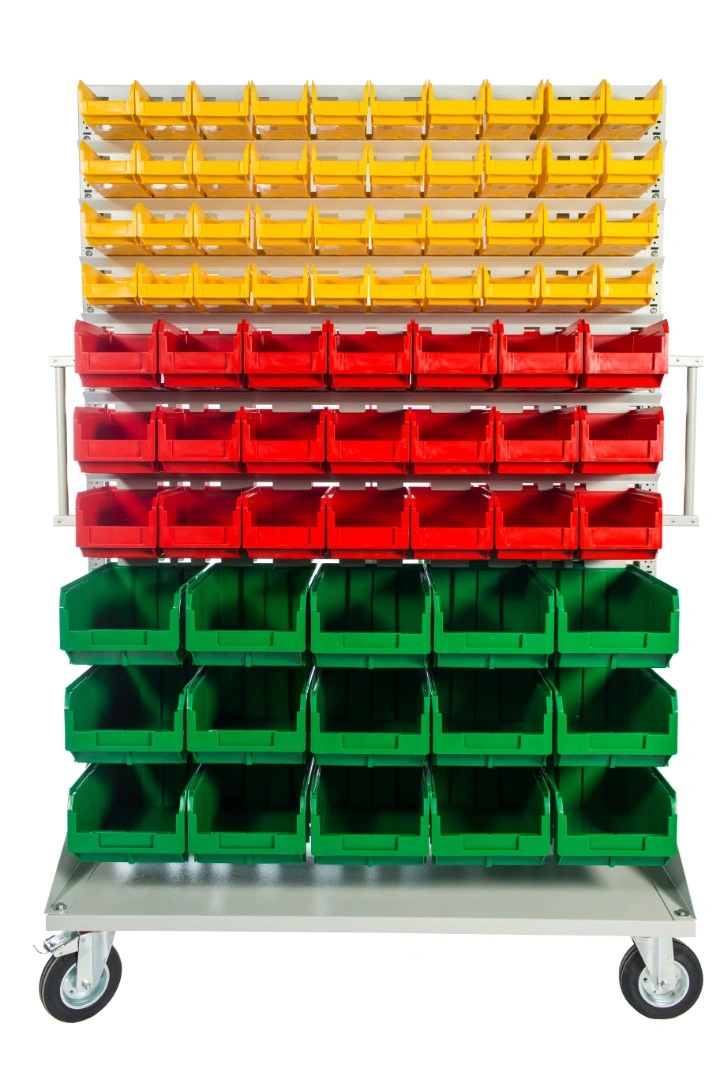 Мобильная стойка M2-100-42-15 - это универсальная модель, которая находит применение на крупных складах, в торговых центрах, а также в различных специализированных мастерских. Пластиковые ящики подвешены на высокопрочных направляющих, которые способны выдерживать распределенную нагрузку до 40 кг. каждая. Наличие 4 колес, 2 из которых поворотные с тормозом, значительно облегчают процесс транспортировки стойки по помещению и фиксации в нужном месте. Наличие большого количества ящиков малой и большой вместимости дает возможность хранения всевозможных ручных инструментов и приспособлений. Комплектация: Стойка под пластиковые ящики 1150х1500мм. без опоры серия К; Опора стойки двусторонняя комплект 2шт., серия К; Платформа мобильная 700х1150мм., под точки крепления колеса 80х60мм. + 2 ручки, серия К; Держатель для стойки 1150мм. - серый, распределенная нагрузка до 40кг. на ряд, серия К- 20 шт.; Колесо 535431 диаметр 150мм., металл, резина, поворотное с тормозом - 2 шт.; Колесо 535911 диаметр 150мм., металл, резина, неповоротное - 2 шт.; V-1 Пластиковый ящик 172х102х75 мм. - 100 шт.; V-2 Пластиковый ящик 234х149х120мм. - 42 шт.; V-3 Пластиковый ящик 341х207х143 мм. - 30шт.; Упаковка. Технические характеристики: ширина 1150мм., высота 1500мм., глубина 700мм. Преимущества мобильной стойки M2-100-42-15 - ящики открытого типа, которые позволяют находить нужные позиции в считанные секунды - это возможно благодаря хорошему визуальному обзору содержимого. Конструкция позволяет максимально эффективно организовать пространство для хранения различных мелкоштучных изделий, таких как крепеж, автозапчасти, сантехнические комплектующие и прочие небольшие предметы. Конструкция стеллажа позволяет одним движением руки извлекать нужный ящик для его наполнения или опустошения, и так же легко устанавливать его на место. Удобная рукоятка для транспортировки. Плавный ход. Высокая мобильность. Нагрузка до 30кг. на ящик. Быстрая сборка. Максимальная грузоподъемность - 400кг. Габариты - 1150х700х1500мм.
