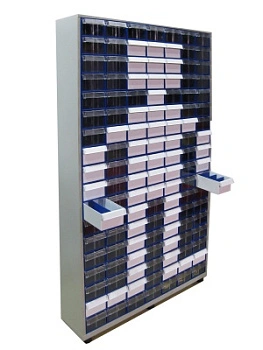 Шкаф в сборе Стелла-техник С-2-126 на 126 коробов (ЛДСП) отлично впишется в интерьер любого склада, подсобного или торгового и офисного помещения. Цвет ламинированного ДСП - серый. Цвет коробов С-2 синий, прозрачный. Главная особенность шкафа – объединение большого количества коробов с определенным типовым размером. Регулируемые ножки шкафа гарантируют устойчивость шкафа даже на неровных полах. Изделие допускает одновременное применение 126 пластиковых складских контейнеров. Прозрачные внутренние короба С-2 позволяют легко находить содержимое и контролировать полноту наполнения. Внутренний короб легко вынимается для опустошения или наполнения, по принципу спичечного коробка. Он имеет рельефную структуру днища и усиленные толстые стенки. За счет этого, изделие справляются с достаточно высокими эксплуатационными нагрузками. Внутренние полезные размеры выдвижного короба: 220х123х80мм. Имеется возможность установки: одной продольной перегородки (артикул: С-2 продольная) или до трех поперечных (артикул: С-2 поперечная). Продольная и поперечная перегородки одновременно не устанавливаются. Перегородки в комплект короба не входят и поставляются отдельно. Рекомендуемая нагрузка на короб, в составе шкафа, не более 2,3кг.