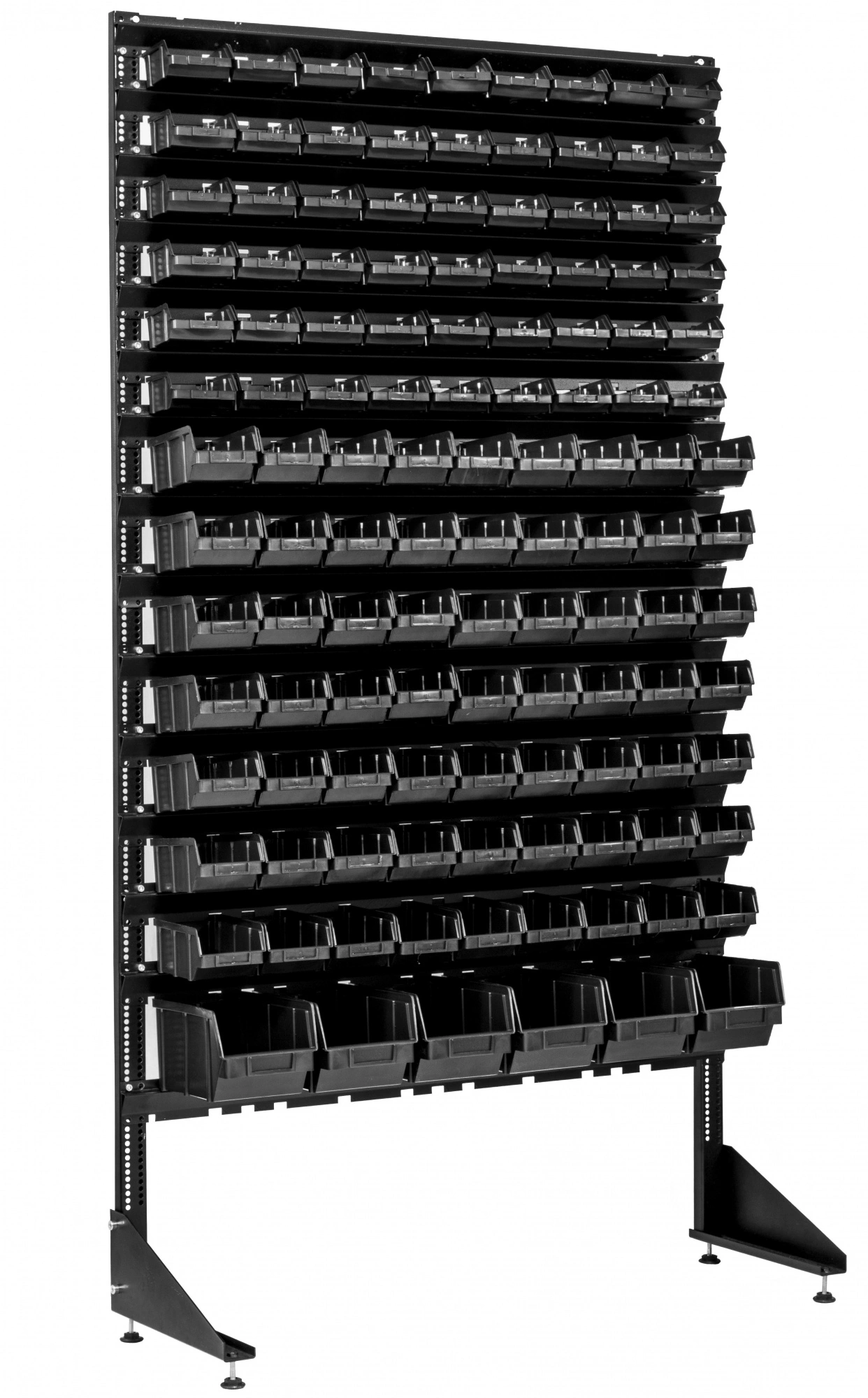 Конструкция данного оборудования, позволяет комбинировать ящиками разных размеров. Перфорация на стойке, позволяет менять шаг в зависимости от размера лотка. Траверсы крепятся на стойку болтами М6, (болты в комплекте).
