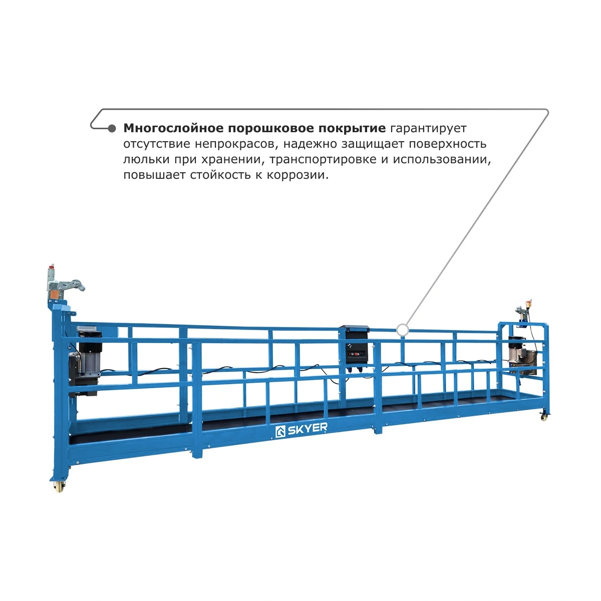 - Многослойное порошковое покрытие гарантирует отсутствие непрокрасов, надежно защищает поверхность люльки при хранении, транспортировке и использовании, повышает стойкость к коррозии.